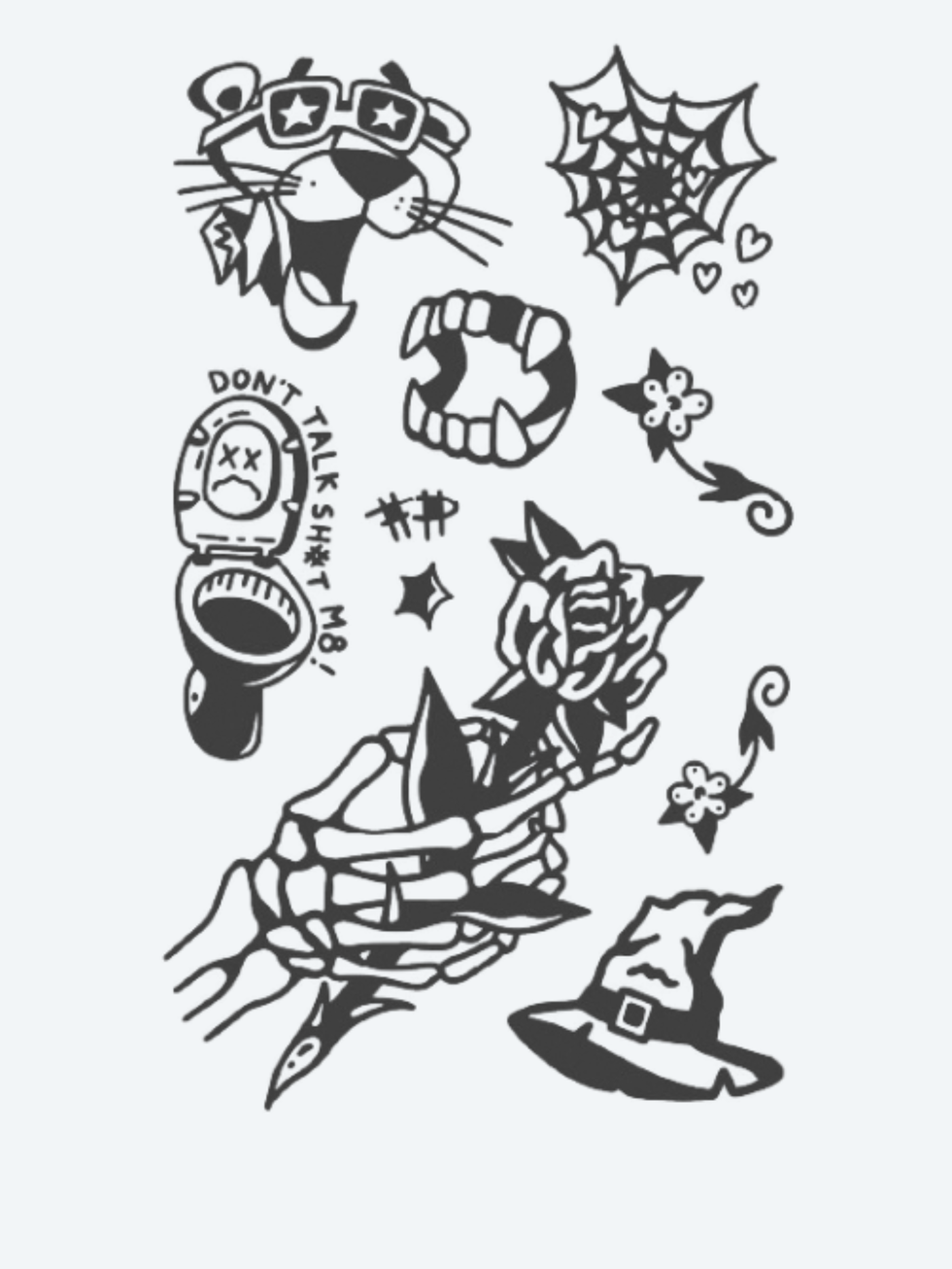 Creepy Halloween is a playful yet eerie tattoo set filled with spooky icons, skeletal hands, fangs, webs, and mischievous characters.